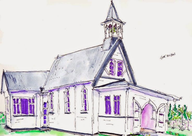 One of our sketchers was delighted to draw this former Kaponga church as he had grown up next door to it. It had been relocated to New Plymouth and is now used for weddings. All the flowers throughout the extensive garden were white. The owner claims it is an expensive garden ornament.