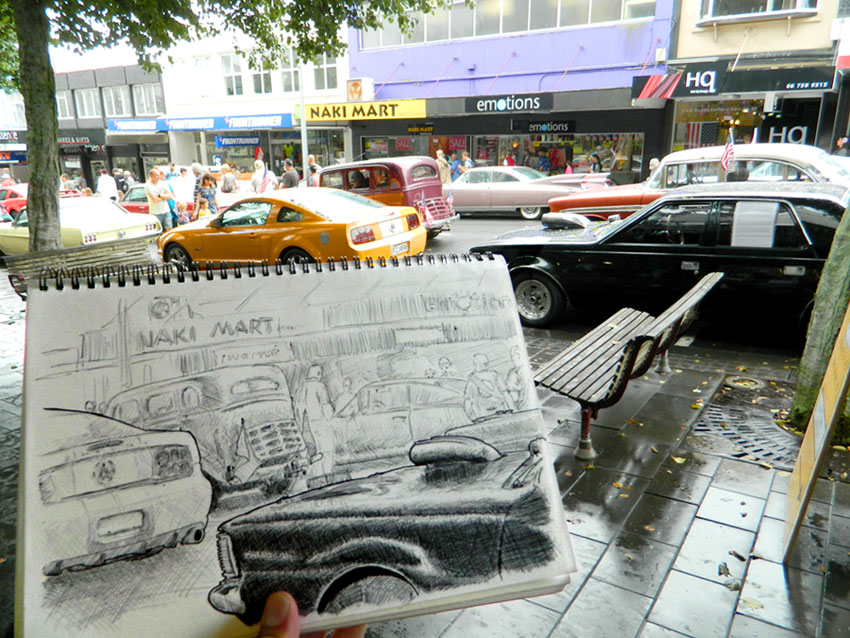 Even with a bit of rain, the final day of the Americarna festival was still popular. I had a prime position on a bench with a view of a massive 1959 Cadillac with huge fins and rocket engine tail lights. When it started to look like it was going to start getting wet, that all went out the window. I didn't wait for a clear path and just drew everything. What you see is a Star Destroyer sized Cadillac with three people and four cars in front of it. (For the enthusiast, a 2008 Mustang Shelby, 1934 Chevrolet, a 1970 Rambler Hornet, and like last year, a 1956 Chevy Belair.) A special shout-out to the several people I met from Wanganui who are waiting for the final version of this one.