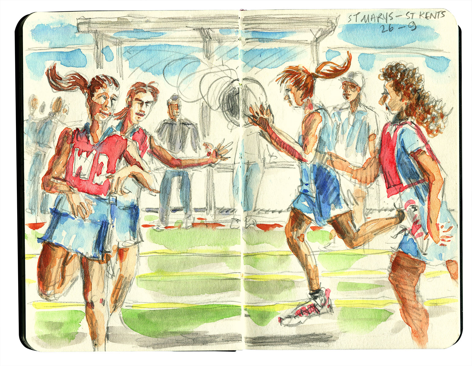 Both of our girls are netballers so that means two trips to the Mt Wellington Netball Centre every week. The weather is usually horrendous – that's just standard – and netball is only cancelled for electrical storms. I optimistically take the little A6 Moleskine and a pencil just in case my digits aren't frozen enough to sketch with.