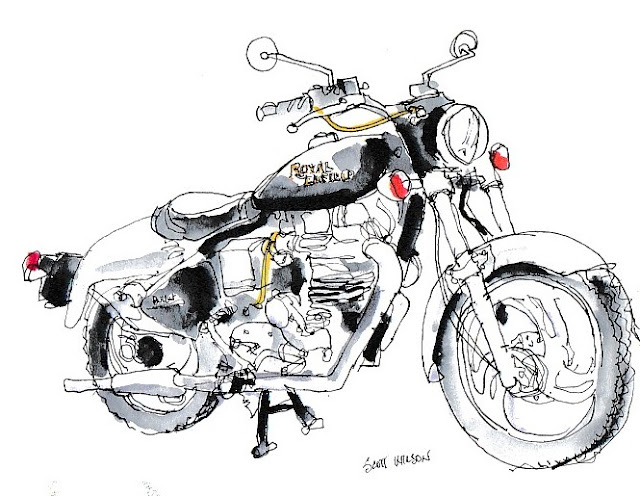 I started out drawing New Plymouth's 1 million dollar tree, the gnarly 150 year old Ombu tree, one of only three in New Zealand when an Indian couple pulled up for a coffee. I say pulled up, but as you can see there is no pillion, so one was following in the car. It started to spit so I moved across to the bike and began umbrella sketching.