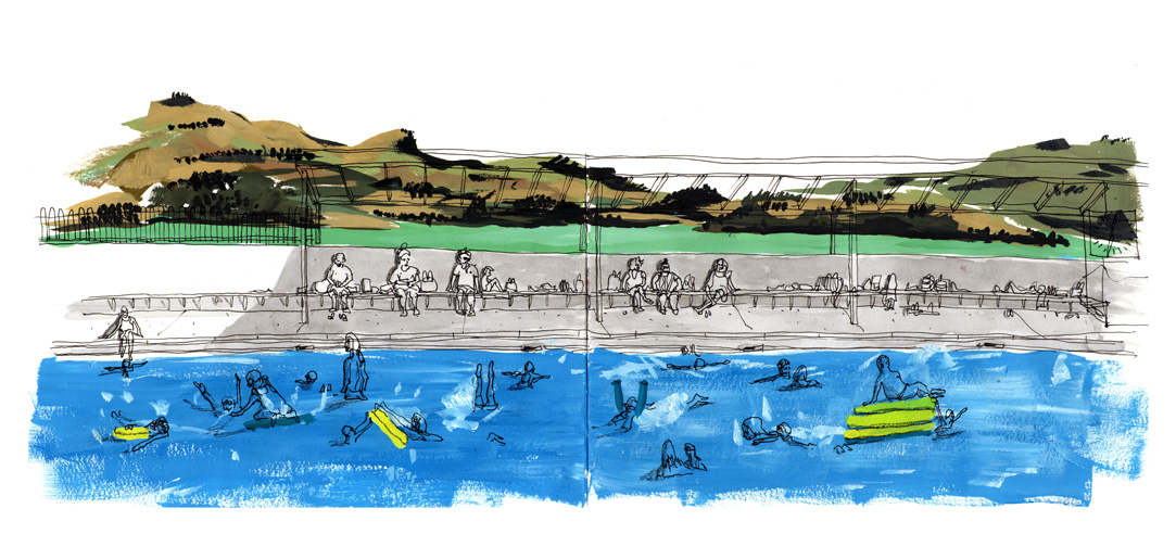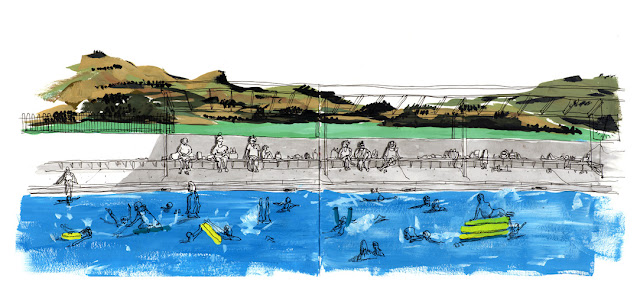 It has been a shy summer so far this year here on the south island, we can have summer and winter days all on the same week, but February is usually the hot month. So now, every day is precious to jump to the water and enjoy. This time we went to the Lyttelton new pools, which has the mountains and the harbor as a background. The kids were happily shouting and the parents were bored waiting. Gouache dry quite fast which is good for a quick sketch, and a the black watercolor gives a bit of drama to the shades.