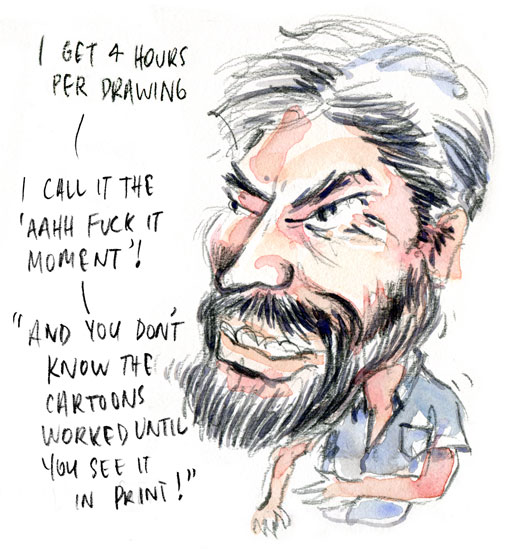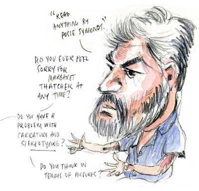 Attended an interesting talk last night at Auckland University. Steve Bell, the well known Guardian political cartoonist is in residence as the Hood Fellow. What a great opportunity to get up close with a cartooning legend. I've always enjoyed viewing Bell's often outrageous cartoons whenever I stumble across them. (Take a look at his cartoons here if you aren't familiar with his work).